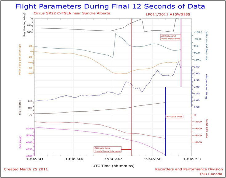 At 1345:35, the aircraft entered a right turn which increased in rate to a maximum of 11° per second. Airspeed increased to 98 KIAS, accompanied by an 80° nose-down pitch and a rapidly increasing rate of descent. Characteristics of this turn were consistent with the early stages of a spin. Footnote 4 When the turn reached 329° M at 1100 feet agl, the aircraft rolled to the left. At 1345:48, the onboard recording quality was compromised due to extreme attitudes, resulting in loss of valid pitch and roll information. At that time, the heading was decreasing to 120° M, an airspeed of 103 KIAS and a vertical descent rate over 5000 feet per minute (fpm) with a positive loading in the vertical axis of 2.4 g. At 1345:51, the last recorded data showed the aircraft 160 feet laterally from the impact point, with airspeed increasing through 132 KIAS, vertical descent rate increasing through 6900 fpm and vertical acceleration reaching approximately 3.5 g. The engine was running throughout the descent to the ground.
