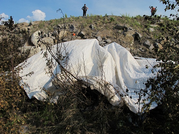 Beyond the turnaround area, the prepared surface gives way to an embankment which descends into a ravine. The slope of the embankment is approximately 30° to 45° and is comprised of gravel, rocks, and large boulders. The slope descends about 20 feet vertically, and then reverses sharply into the contour of a ravine.