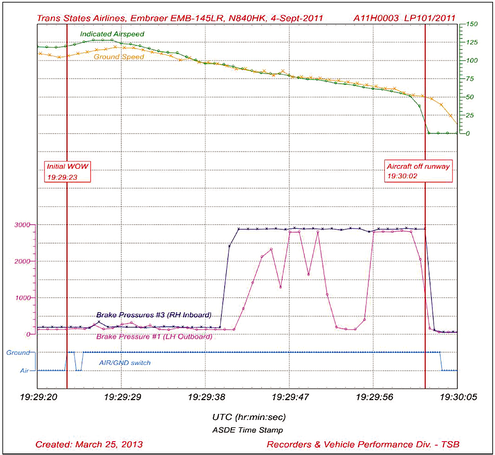 The brake system includes touchdown protection that inhibits brake actuation before the main wheels have spun up during landing. This feature prevents brake application through the brake pedals before wheel spin-up when the aircraft is on the ground for less than or equal to 3 seconds, or when the wheel speed is less than or equal to 50 knots, whichever occurs first. The pressure at the brake will be the lowest pressure resulting from comparing pedal position, anti-skid protection, touchdown protection, and locked wheel protection. In this occurrence, about 1 second after touchdown, the pressure at the no. 1 and no. 3 brakes increased to about 400 psi (Appendix B). Footnote 9 Over the next 12 seconds, the no. 1 brake pressure fluctuated between 0 and about 300 psi, and then began fluctuating between 0 and 3000 psi until the aircraft departed the runway. During this same period of time, the no. 3 brake pressure fluctuated between 0 and about 200 psi, and then stayed at 100 psi for about 5 seconds. The pressure then increased rapidly to maximum system pressure, and stayed at or slightly below maximum pressure until the aircraft departed the runway.