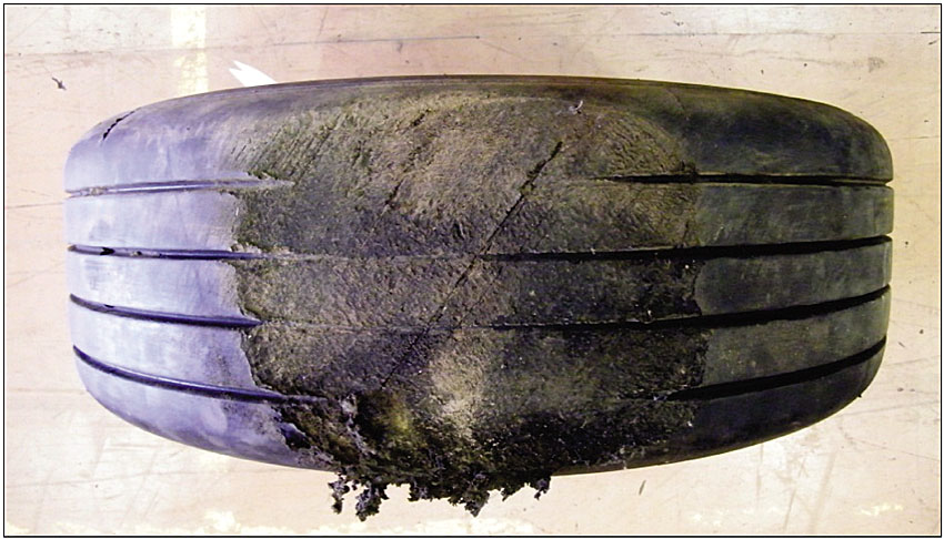 Signs of reverted rubber hydroplaning (section 1.18.1) were observed on all 4 main tires (Photo 3). Skid marks running approximately 55° to the aircraft axis were visible atop the reverted rubber regions. Steam-cleaned marks from all 4 main wheel tires were observed in various locations along the runway (Photo 4).