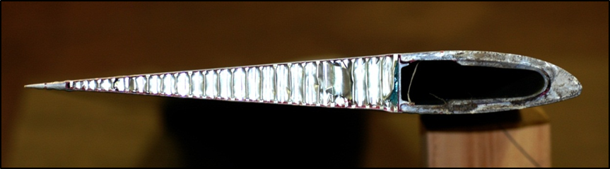 The surface of the spar at the fatigue origin exhibited no evidence of corrosion or previous mechanical damage; however the overall fracture pattern was very similar to the pattern in this occurrence. The origin of the fatigue crack coincided with a large void in the adhesive between the inside surface of the spar and the lead weight.