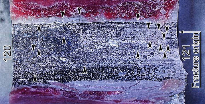 The lead weight was not completely sealed at its edges due to micro-cracks in the adhesive material adjacent to the lead weight (Photo 6 – large black arrows within dashed areas). Therefore, moisture penetrated through the gap between the lead weight and the spar. This allowed corrosion of the inner surface of the spar where there was a void in the adhesive, as well as corrosion of fracture surfaces while the fatigue cracks were growing. The appearance of the corrosion scale was consistent with a long-term exposure of aluminum to moisture. Corrosion can accelerate fatigue by providing sites suitable for crack nucleation (corrosion pits) and by increasing the crack propagation rate. The corrosion scale on the fracture surface diminished with distance from the fracture origin. The corrosion may have contributed to the initial crack growth, but unlikely played any role in the crack propagation in the chord-wise direction during the faster, unstable growth.