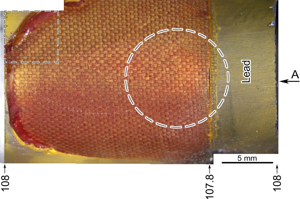 The lead weight edges of the mating blade were completely sealed. Therefore, unlike the adhesive in the occurrence blade, the voids in the adhesive were not connected with the inner cavity of the blade and there were no signs of corrosion. The mating blade spar did not have any cracks, even though there was a large void in the adhesive between the spar and the mid-span lead weight.