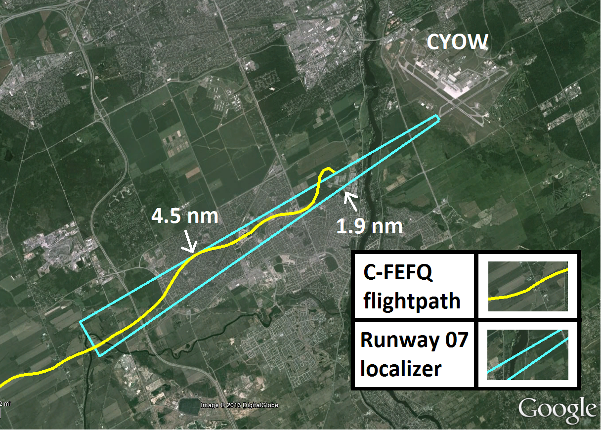 At 1906, Ottawa Terminal Air Traffic Control (ATC) cleared C-FEFQ for the ILS approach to Runway 07 and issued radar vectors to intercept the final approach course. The aircraft intercepted the localizer approximately 8 nm from the threshold, and the terminal controller instructed C-FEFQ to contact the Ottawa tower controller. The tower controller informed C-FEFQ that the aircraft was number one in the landing sequence. At approximately 4.5 nm from CYOW, while on the ILS approach, the aircraft began to deviate north of the localizer. The tower controller informed C-FEFQ of the deviation. The pilot acknowledged the information, and informed the tower controller that they were trying to get back on track. A minute later, as the aircraft was approaching the center of the localizer, the tower controller cleared C-FEFQ to land. Shortly after receiving the landing clearance, the aircraft began to deviate northbound again; the controller informed C-FEFQ of the deviation. There was a brief, unrecognizable transmission on the tower frequency, but it could not be confirmed that it came from C-FEFQ. Eighteen seconds later, the controller instructed C-FEFQ to pull up and go around. There was no response.