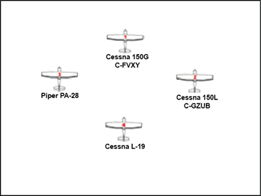 The lead aircraft was the Cessna 150G (C-FVXY) with 2 occupants on board. On the right-hand wing of the leader, in the number 2 position, was the Cessna 150L (C-GZUB) with only the pilot on board. Also in the group was the Piper PA-28-180, with 2 occupants on board, in the number 3 position on the leader's left side. The solo Cessna 305A (L-19) was in the number 4 position at the rear of the other 3 aircraft.