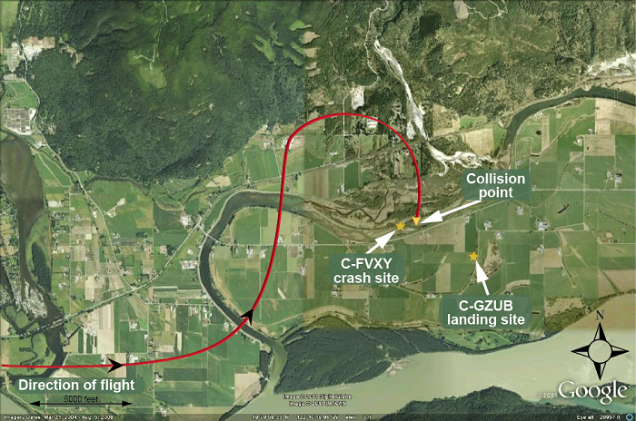 - The impact damage resulting from the in-flight collision rendered C-FVXY uncontrollable, and the aircraft was unable to maintain flight; it descended rapidly and collided with the terrain.