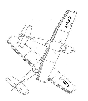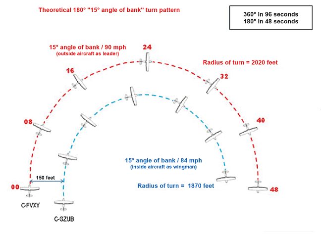 The Transportation Safety Board of Canada (TSB) Laboratory examined the known flight path information and, using computer-assisted drawing and design software, estimated a plausible flight path for the 2 accident aircraft. Several assumptions were made as the basis for these calculations: 90 mph airspeed, 1500 feet asl altitude, and 15° angle of bank. It was assumed that the lead aircraft maintained the airspeed and the angle of bank throughout the manoeuvre, as there was no information to suggest otherwise. It was also assumed that the number 2 wingman aircraft (C-GZUB) did not slow down sufficiently to maintain the assigned formation station on the right wing of the leader.