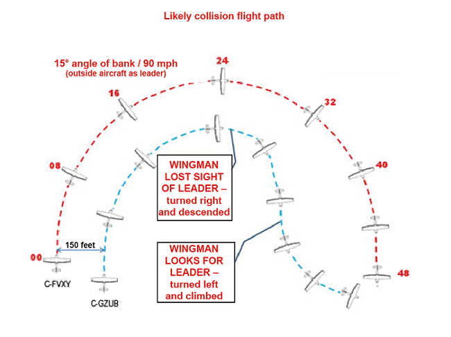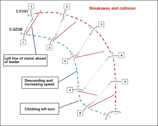 - After initially adopting a flight path that effectively eliminated the risk of collision, the pilot of C-GZUB turned back toward the leader so as to rejoin the formation, thereby unintentionally placing the aircraft on a course leading to their collision.