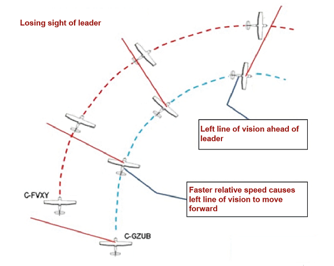 - During the right-hand turn in formation flight, the pilot of C-GZUB lost sight of the leader (C-FVXY).
