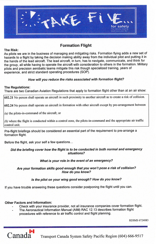 Transport Canada (TC) issued a safety bulletin regarding the hazards surrounding formation flying. TC's Take Five “Formation Flight” brochure (TP 2228E-39) highlights the importance of pre-flight planning and flying skills in reducing the risks associated with formation flying (Appendix B).