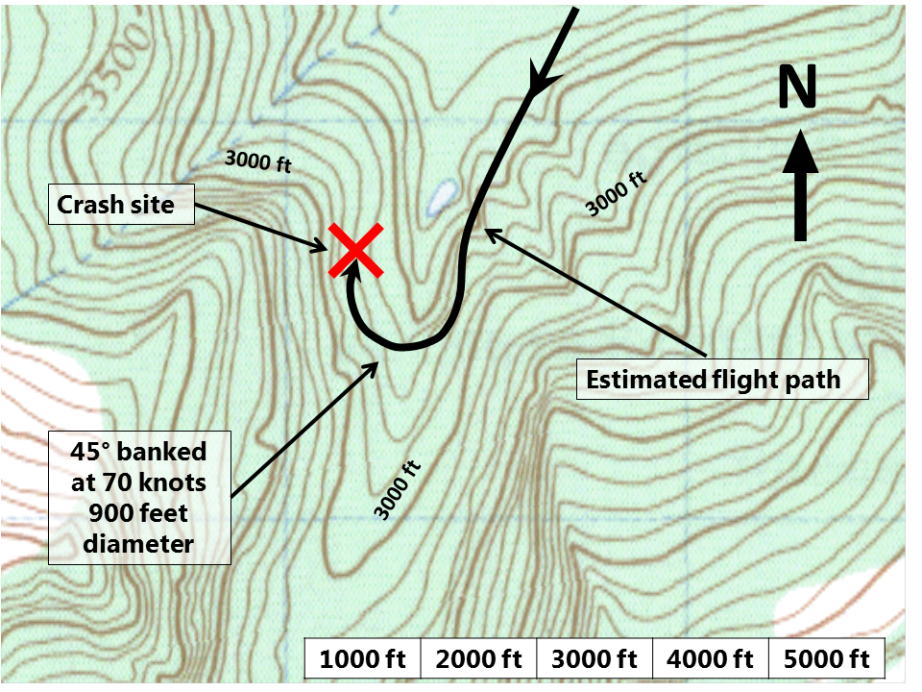 During the simulations, it became apparent that a turn in this location was very difficult and resulted in several crashes when the simulator was flown with the flaps up. From an altitude of 3000 feet asl, the aircraft was rolled into a 45° banked turn. If the bank angle was increased to 60° or more, the aircraft stalled and crashed 9 seconds after the beginning of the turn. The first several attempts resulted in crashes at the location of the accident. It became immediately apparent that the terrain blocks out all useful references to the horizon, and the desire to over-bank to avoid what looks like an impending impact is instinctual. With the use of full flaps and diligent use of instruments to maintain a 45° bank angle, the turn could be accomplished.