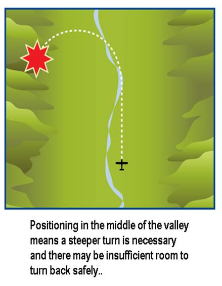 Without experience and familiarity in the mountains, it is difficult to determine the scale, and therefore the distance, from the mountainsides when flying in close proximity to large mountains. In a confined area, a pilot must fly close to the side of the mountain to allow room to turn. This task can be difficult for those without experience, and students tend to be further from the mountains than they think they are (Figure 4 and Figure 5, courtesy of the New Zealand Civil Aviation Authority).