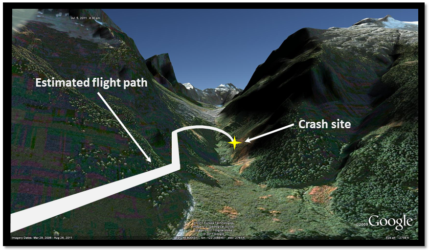 The site of the occurrence is in a narrow canyon that branches off a larger valley. The floor of the valley rises steadily from Harrison Lake to the mouth of the canyon, where it then rises rapidly into the canyon. At the end of the canyon is a pass that is 3100 feet above sea level (asl) and leads to Stave Lake. Both sides of the canyon rise steeply, with slopes approaching 60°. Both sides of the pass were capped with snowfields starting at approximately 4000 feet asl and extending up to 6500 feet asl. The west side of the pass was in shadow below 4000 feet asl, while the east side of the pass was in bright sunshine. The investigation determined the likelihood that the aircraft turned in the canyon, resulting in a stall from a low altitude (Figure 1).