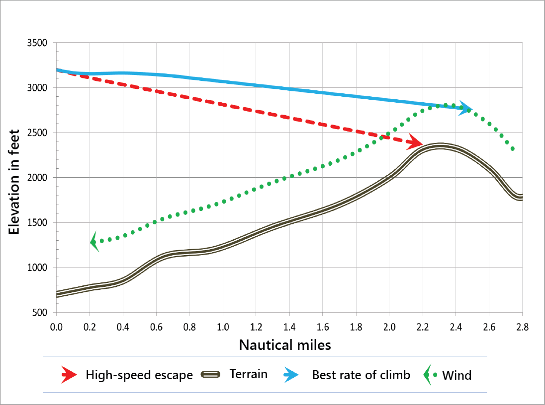 The graph (Figure 7) shows 2 possible flight paths that aircraft could take when encountering an area of down-flowing air that is the result of a 15-knot wind flowing down a 30° slope. Both aircraft start at the same cruise speed of 100 knots. Both aircraft go to maximum power, and both would be climbing in still air. The solid blue line indicates the flight path of an aircraft that reacts by sacrificing forward speed for an initial climb while reducing speed to the best-rate-of-climb speed of 65 knots. The aircraft clears the hill with 500 feet to spare. The red dashed line depicts the path an aircraft would take if it accelerated and maintained 110 knots. At this higher speed, the aircraft impacts the hill just below the top. This example may not reflect what would happen in an actual event. However, it does show that there is a discrepancy in the theory, and that further research into this subject may be necessary.