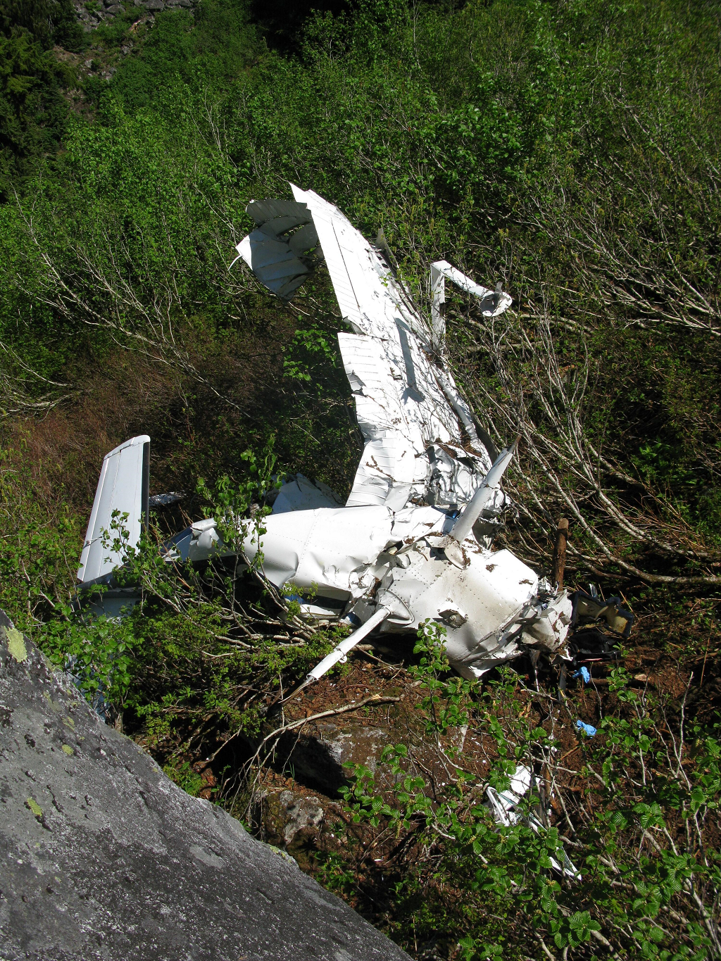 Both wings were extensively damaged; the wing center and cabin ceiling had been torn off with the wings still attached. The fuselage was broken behind the rear bulkhead, and the tail section was folded over the wreckage. The tail itself only suffered minor damage. The wing fuel tanks were torn open, spilling the remaining fuel, but there was no fire. While no fuel was found in the tanks, traces of fuel were found in the soil beneath the main wreckage. All major components remained loosely attached with cables and torn metal. Only some small parts were ejected, and were found no more than 35 feet down-slope from the main wreckage.