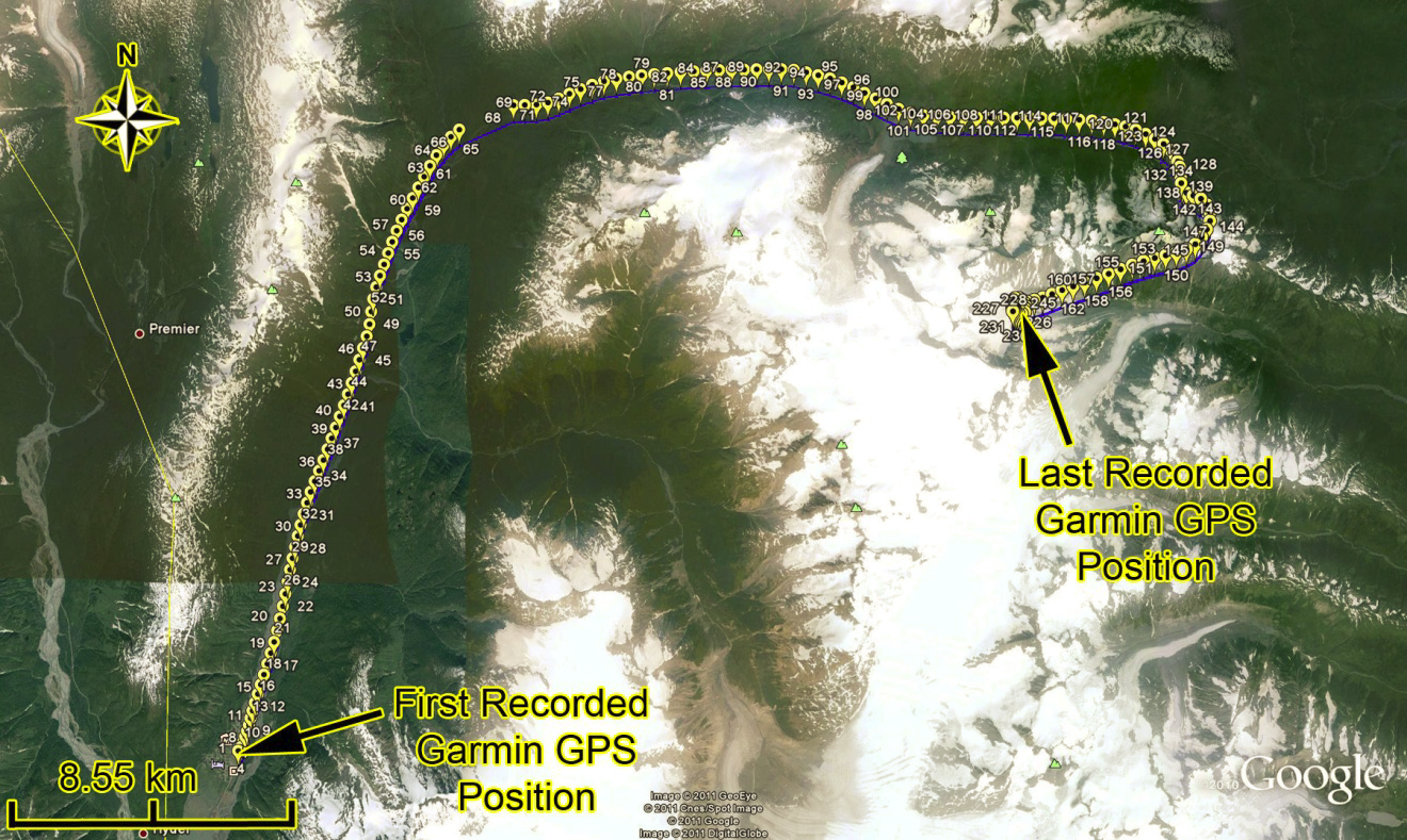 The VIH Helicopters Ltd. Bell 407 helicopter (registration C-GNVI, serial number 53847) departed Stewart Airport at about 0943 Pacific Daylight Time (PDT), with the pilot and 2 passengers on board. The helicopter flew to a geological exploration site 14 nautical miles north of Stewart, British Columbia, adjacent to the Nelson Glacier. There were no further voice communications with the occurrence aircraft following departure, and flight tracking data stopped at 1004 PDT. Approximately 6 hours later, the wreckage of C-GNVI was discovered strewn down the steep mountain side at the exploration site. There were no survivors. The 406-megahertz emergency locator transmitter had activated, but the antenna and antenna cable were damaged, and a signal was not received by the Canadian Mission Control Centre. There was no fire.