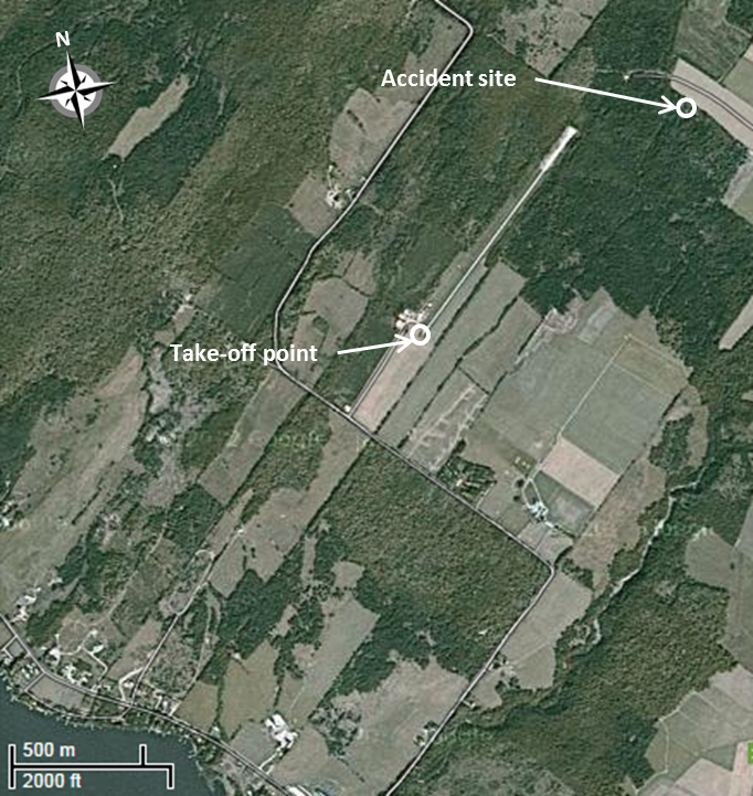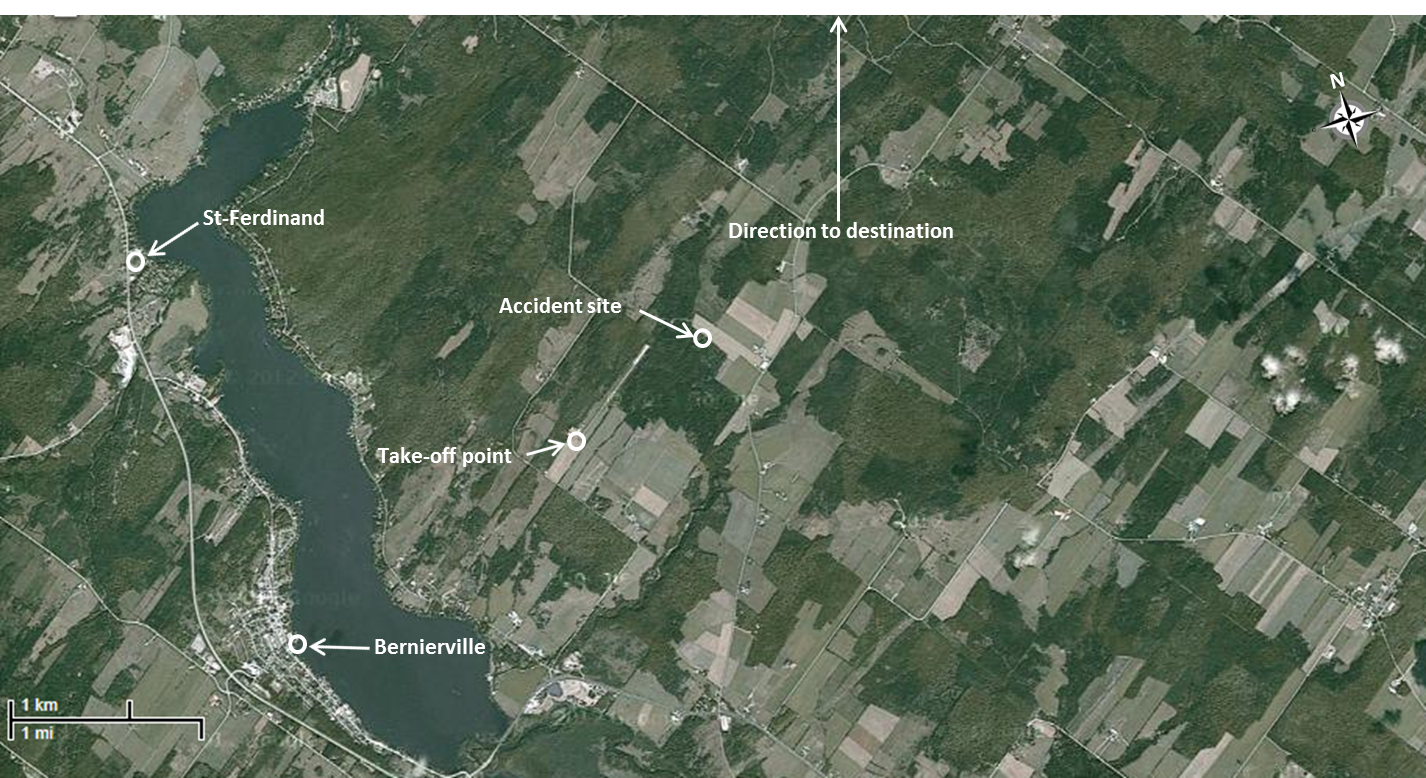 The elevation of the Saint-Ferdinand Aerodrome is 1050 feet asl. Runway 05/23 was an unlit Footnote 16 3000‑foot long by 75-foot wide grass/gravel runway. Beyond the end of Runway 05 is a wooded area; however, the end of Runway 23 abuts on an unobstructed field of almost 1400 feet that slopes toward a lake. The aerodrome has no aircraft rescue and firefighting (ARFF) services, nor are they required by regulation.