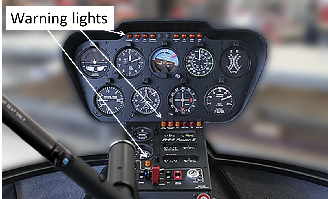 The R44 Raven II is equipped with 15 warning lights that warn the pilot of conditions requiring attention. Eight of these lights are located at the top of the instrument panel, and 7 are in the middle panel (Photo 1). Footnote 19