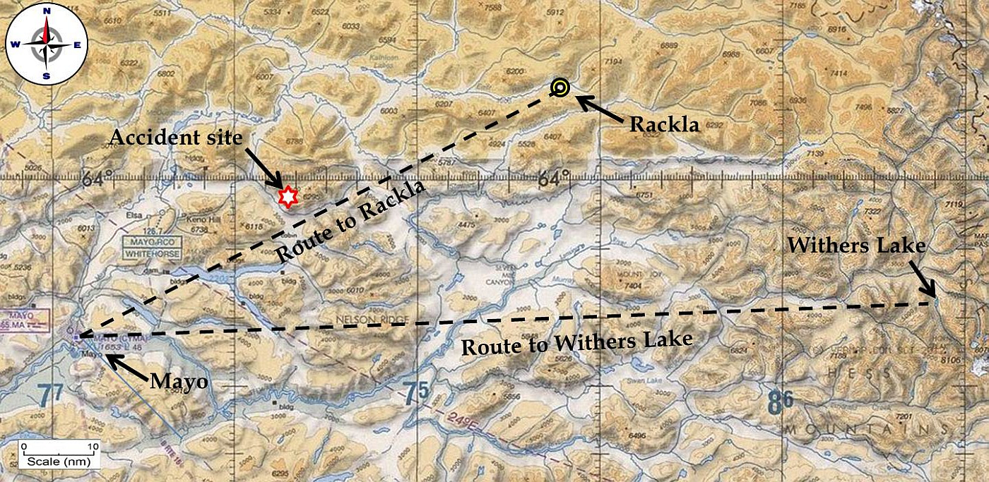 The pilot had arrived at the Mayo Airport at about 0630 Footnote 1 on the morning of the accident. The pilot's first trip of the day was to Withers Lake, departing Mayo at 0834. The pilot completed 2 trips to Withers Lake and 1 trip to Rackla prior to the accident flight. The accident flight departed Mayo at 1448 under visual flight rules (VFR) on a company itinerary. At 1507 the Canadian Mission Control Centre (CMCC) received a 406-MHz emergency locater transmitter (ELT) alert. Joint Rescue Co-ordination Centre Victoria (JRCC Victoria) was notified at 1522. Aircraft operating in the area were alerted, and a commercial helicopter was dispatched from Ross River, Yukon, approximately 1 hour later to search for the aircraft. The helicopter crew located the aircraft wreckage at 1833 at about 4300 feet above sea level (asl), on a remote, snow-covered hillside 38 nautical miles (nm) northeast of Mayo.