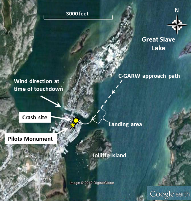 The float-equipped de Havilland DHC-6-300 Twin Otter (registration C GARW, serial number 367) was landing at the float-plane base (CEN9) located in Yellowknife, Northwest Territories, along the western shore of Great Slave Lake, beside the area known as Old Town. There were 2 crew members and 7 passengers on board, and the first officer was the pilot flying. On touchdown, the aircraft bounced, porpoised and landed hard on the right float. The flight crew initiated a go-around; the aircraft lifted off at low speed in a nose-high, right-wing-low attitude, and it continued in a right turn towards the shore. As the turn continued, the aircraft's right wing contacted power lines and cables before the float bottoms impacted the side of an office building. The aircraft then dropped to the ground on its nose and cart-wheeled into an adjacent parking lot. Both crew members were fatally injured, 4 passengers were seriously injured, and 3 passengers sustained minor injuries. The aircraft was substantially damaged. The 406 megahertz emergency locator transmitter activated. There was no fire. The accident occurred at 1318 Mountain Daylight Time.