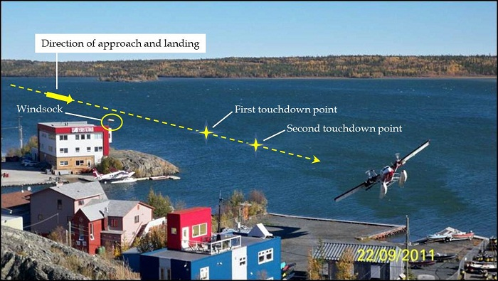 Due to the 2 to 3-foot waves (rollers) on the lake, the crew planned their approach so as to land close to the shore and to avoid entering the passage between the shore and Jolliffe Island (Figure 1). The captain also advised that the airspeed should be kept above 80 knots indicated airspeed (KIAS), which is 10 KIAS above the normal approach speed of 70 KIAS, for the full-flap (37.5°) approach and landing. During the approach, the captain cautioned the FO twice about the airspeed getting too low. The aircraft touched down in the intended landing area and bounced, then contacted the water a second time with the right float first. The float dug in, and the aircraft yawed to the right, turning towards the shore. The stall warning sounded for about 0.3 seconds.
