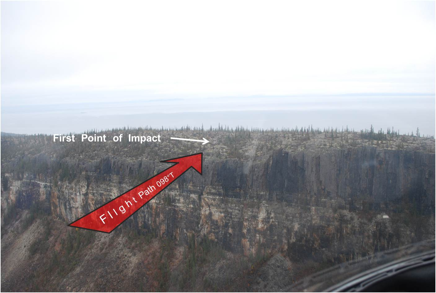 The first point of impact was at an elevation of 1013 feet asl, 38 feet below the top of the peninsula, and 20 feet above the face of a vertical cliff. As indicated by light wing strikes on tree-tops and ground scars, the aircraft was in a nearly level attitude in pitch and roll. First ground impact was by the landing gear, followed by the belly cargo pod and the propeller, all of which separated from the aircraft at this point. The aircraft continued up a 10° slope over the top of the hill, became airborne, and came to rest inverted 477 feet down the eastern slope of the peninsula. The cockpit was crushed, and the forward passenger cabin was distorted, with the forward cabin bulkhead mostly dislodged from its attachments. The left wing had folded back, and rested on the ceiling of the cabin.