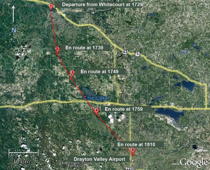 On 05 October 2011, the pilot departed Whitecourt Airport at approximately 1729Footnote 1 (Figure 1). The flight was a visual flight rules (VFR) flight returning to Drayton Valley Industrial Airport (via the McLeod River Valley, Highway 16 and Highway 22), where the pilot resided. The pilot departed Whitecourt Airport with approximately 50 US gallons of fuelFootnote 2 on board. The planned duration of the flight was 1 hour. Assuming a normal fuel consumption of 25 US gallons per hour, C-FHTT left Whitecourt with approximately 2 hours of fuel on board. The pilot checked the weather for Edmonton and Edson, Alberta, and discussed it with the chief pilot/owner prior to departure. They agreed on the routing to be used with the reported weather and that, should the weather deteriorate, an option was to return to Whitecourt, land, and the company would pick up the pilot by vehicle. When located 25 nautical miles (nm) south of Whitecourt Airport, the pilot made a cellular telephone call to a friend in Drayton Valley, indicating that the flight was encountering bad weather and inquiring as to the conditions at Drayton Valley. The pilot reported being at 7000 feet above sea level (asl) on top of the clouds and that there were no holes through which to descend. While the flight departed with a handheld global positioning system (GPS) unit on board, none could be found in the wreckage.