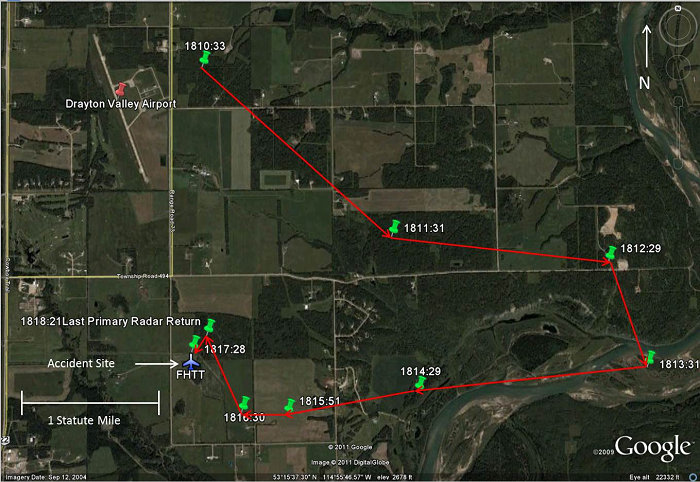 At 1803, the pilot made another telephone call reporting that the aircraft was located 15 miles north of Drayton Valley. The SPOT™ Satellite MessengerFootnote 3 flight tracker data that was retrieved showed its actual position as northwest of the airport.