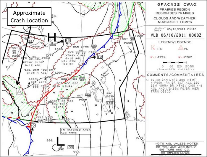 Reported weather conditions upon departure from Whitecourt indicated that ceilings were 600 to 900 feet above ground level (agl) and visibility was 3 statute miles (sm). According to the graphic area forecast (Figure 3), the western part of Alberta, along the Rocky Mountains and along the route to Drayton Valley were forecast to experience broken ceiling from 3000 to 4000 feet asl with layers to 20 000 feet asl. In this area, intermittent visibilities of 4 to 6 sm in light rain and mist were forecast, with scattered altocumulus castellanus clouds to 22 000 feet asl. Also forecast were extensive ceilings of 400 to 800 feet agl and visibilities of ½ - 2 sm in fog and mist. Higher terrain would have been obscured. Patchy moderate mixed icing conditions were forecast between the freezing level (7500 to 10 000 feet asl) and 18 000 feet asl.