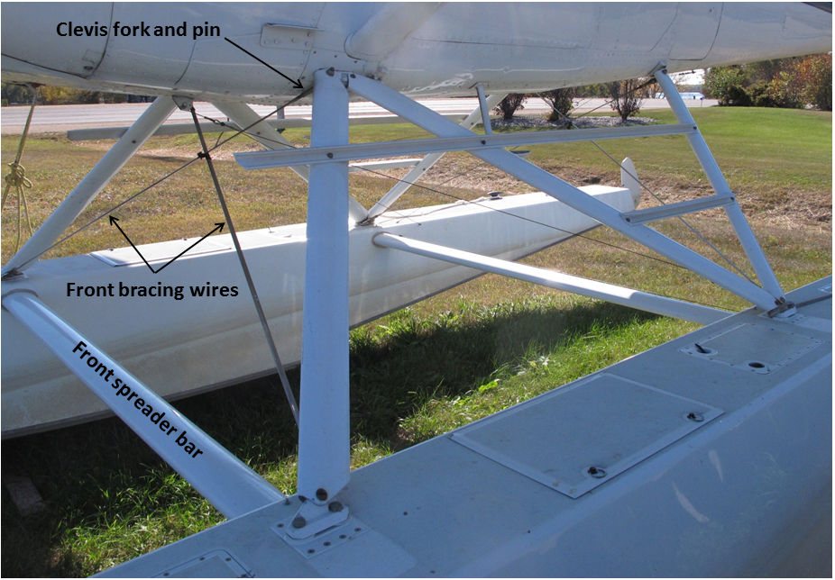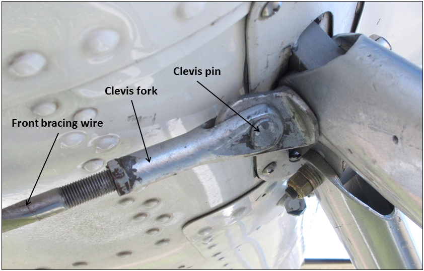 - For undetermined reasons, a clevis pin that attached a front bracing wire to the left landing-gear adapter was not secured by a cotter key. As a result, shortly after take-off, the clevis pin likely fell out of the clevis fork, and the front bracing wire became disconnected.