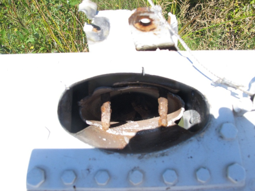 The spreader bars were found to be severely corroded within the float-socket attachment point. The corrosion had developed around wood filler plugsFootnote 2 in the spreader bars, and was concentrated around the holes for the steel through-bolts. The through-bolts were severely corroded and were impossible to remove. Bolts in the right-rear spreader bar had corroded to the point that the bolt diameters were reduced by approximately 50% (Photo 5). The front spreader bar was broken and pulled out of the left float socket. The rear spreader bar was broken at the right float, but was still captive within the socket.
