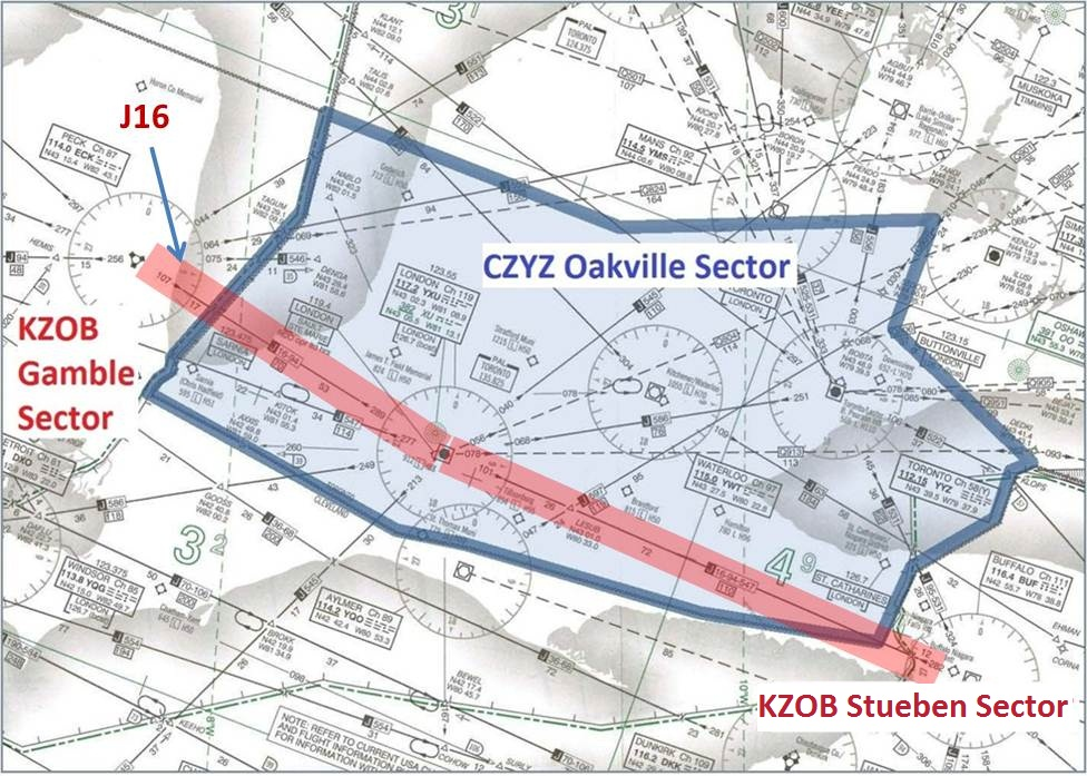 The portions of J16 on either end of this segment are controlled by the Cleveland Air Route Traffic Control Center (KZOB ARTCC, hereinafter referred to as KZOB), Gamble sector to the west, and Stueben sector to the east (Figure 1). At the time of the occurrence, both Gamble and Stueben sectors were staffed by 2 controllers.