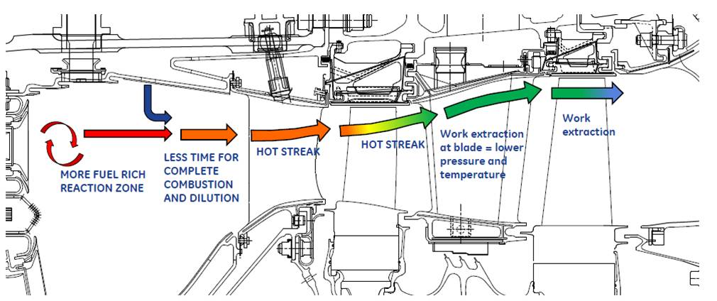 After the engine S/N 906-435 failure, another investigation was initiated by GE. The engine teardown revealed that the initial distress was located between shroud number 31 and number 33. Testing of the fuel nozzles did not provide any findings that would directly contribute to the shroud distress. It is believed that, under the right operating conditions, a fuel-rich zone can exist downstream of the igniter. In normal hardware conditions, this fuel-rich zone would pass through the HPT and into cooler temperatures, following work extraction in the turbine stages, with no effect on engine operation. However, if a hole greater than 0.3 inches in diameter develops in an HPT stage 1 shroud, the hot fuel-rich air can be ingested in the region behind the shroud. The larger volume of air in this region can mix with the fuel-rich air and become a super-heated zone. The temperatures of this super-heated air mixture would be well above the melting point of the surrounding materials, which would quickly lead to rapid deterioration of the shroud hanger and stage 2 nozzle outer bands. This would lead to the release of a stage 2 nozzle and cause the resultant downstream hardware damage.