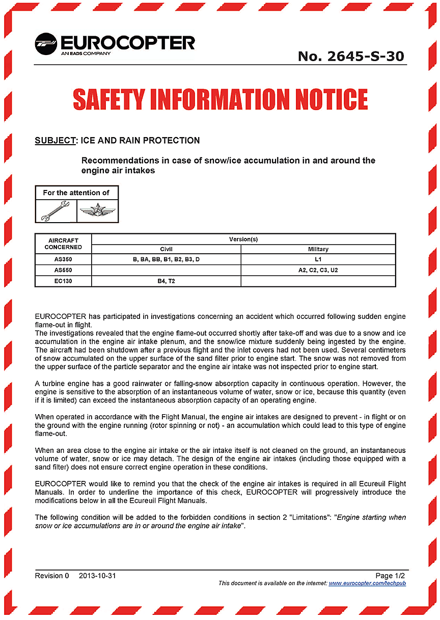 - Eurocopter SL No. 1270-00-96 REISSUED (January 2001): Protection and Operation of Helicopters in Snowy Conditions