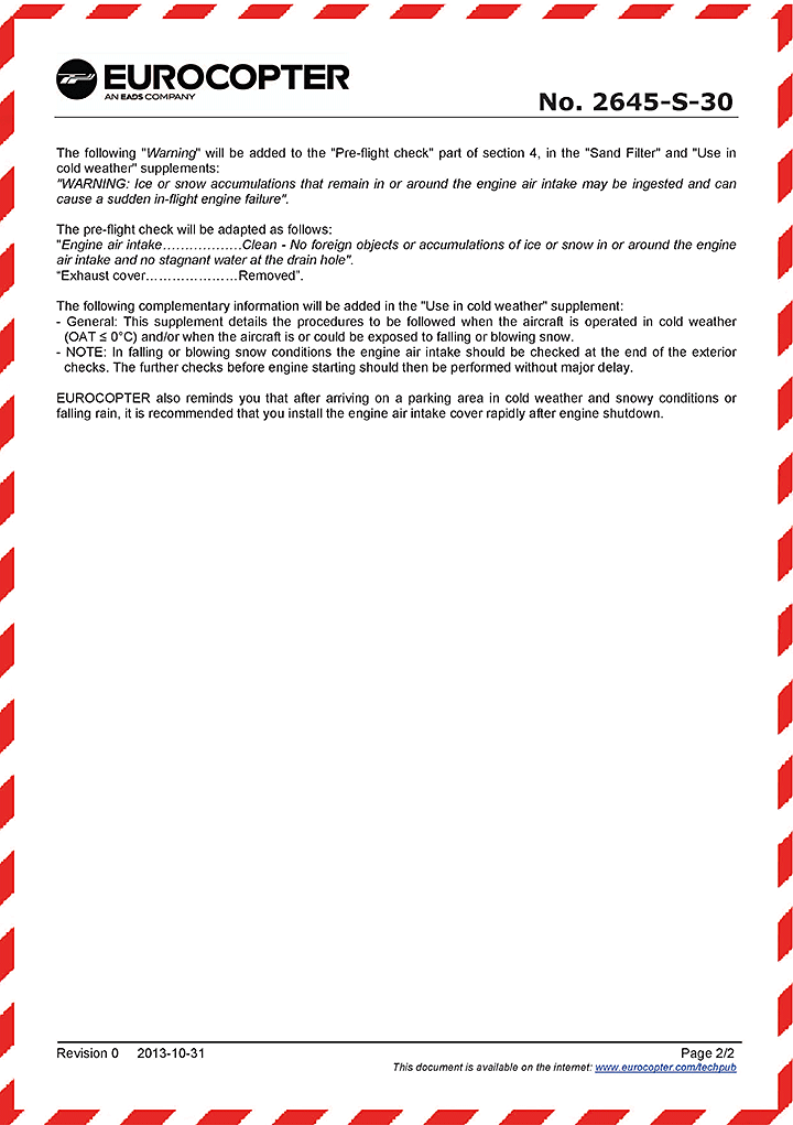 - Eurocopter In No. 2302-I-00 (April 2011): Protection and Use of Helicopters in Cold Weather and in Damp Conditions