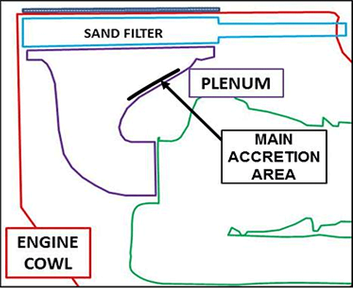 The helicopter air intake had been equipped with a Eurocopter air particle separator (QB0550), more commonly referred to as the sand filter, to protect the engine from ingestion of airborne particles. By design, no part of the air intake system was heated.