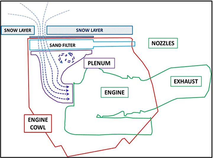 As well, as a result of the airflow speeds entering the plenum and engine intake, a reduction of air temperature takes place as the air moves through the engine's intake air plenum toward the engine compressor. Turbomeca computation results indicate the temperature at the engine mouth would be around −12°C.