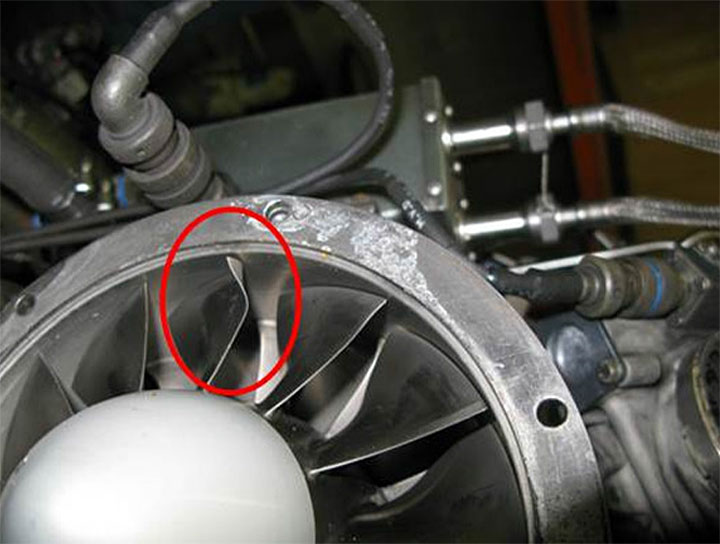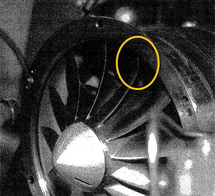 Visual examination of the engine inlet section revealed damage to 1 of the compressor blades (Photo 4). The investigation determined that the blade became bent during the loss-of-power event. However, nothing prevented engine test cell runs following the occurrence.