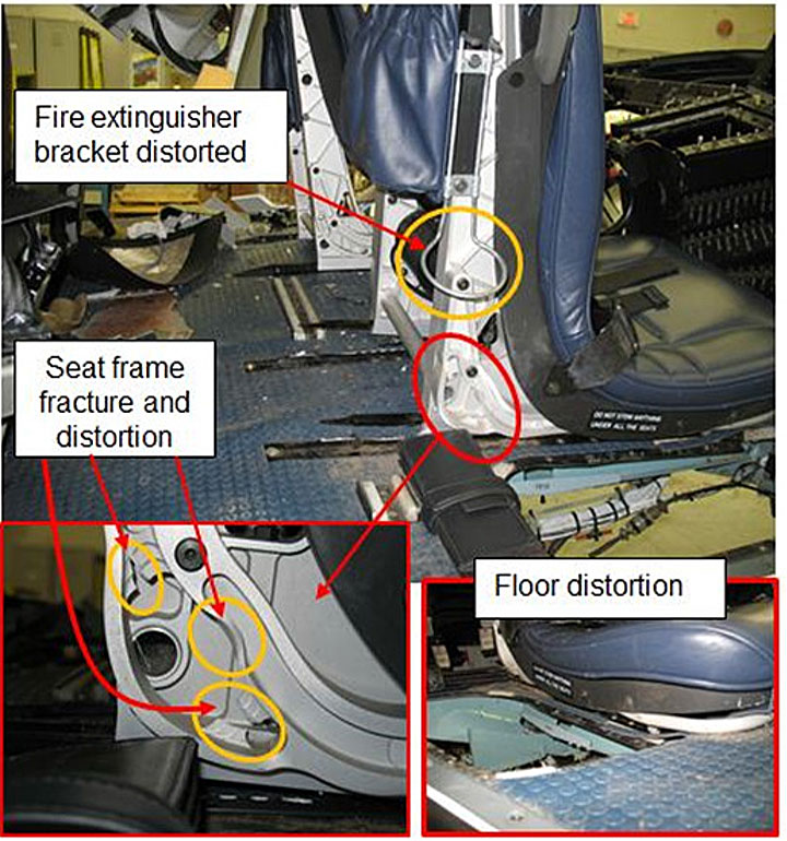 The pilot's seat was an energy attenuating design, and it had collapsed and deformed the floor.