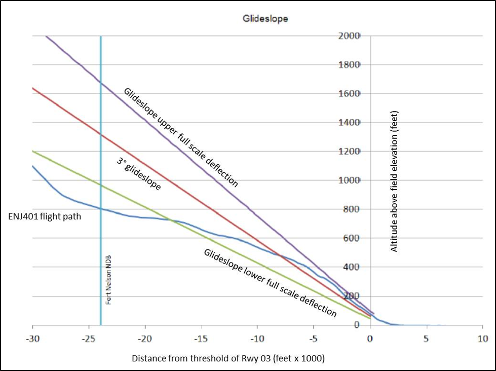 Three minutes prior to touchdown, and approximately 6 nm from the threshold of Runway 03, ENJ401 was descending through 3000 feet asl (1750 feet agl), and was flying a final approach course intercept heading of 015°M at a speed of 174 KIAS. Flaps were set at 5 and the landing gear was extending, followed shortly after with a selection of flap 15. A speed of 157 KIAS had been selected in the speed window of the MCP. The captain's primary flight display (PFD) showed the localizer pointer moving in from the left and a full upper-limit deflection of the glideslope pointer. The AFDS had captured the localizer.