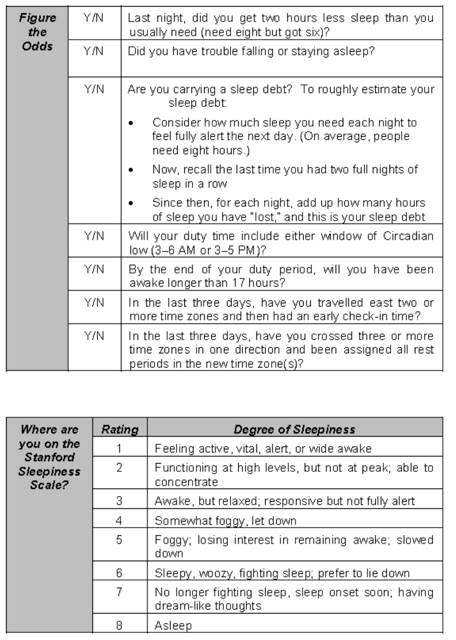 The second section, “Where are you on the Stanford Sleepiness Scale?”, is subject to context effects. If the context of the assessment is an exciting one such as the first flight as a captain, then the heightened arousal state may have masked the underlying risks associated with fatigue in the short term.