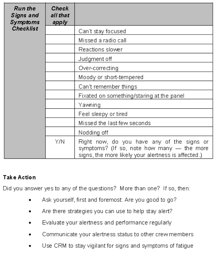 Finally, the “Take Action” section relies entirely on self-perception of the ability to handle the fatigue identified in the checklists. People are poor predictors of their own level of fatigue and the effects that fatigue will have on their performance. Furthermore, when answering questions such as “Ask yourself, first and foremost: Are you good to go?” and “Are there strategies you can use to stay alert?”, other motivators such as sense of responsibility to the company, or need to be employed are likely to factor into their assessment of fatigue severity. Reliance on pilots monitoring their own level of fatigue may not always identify unacceptable levels of fatigue.