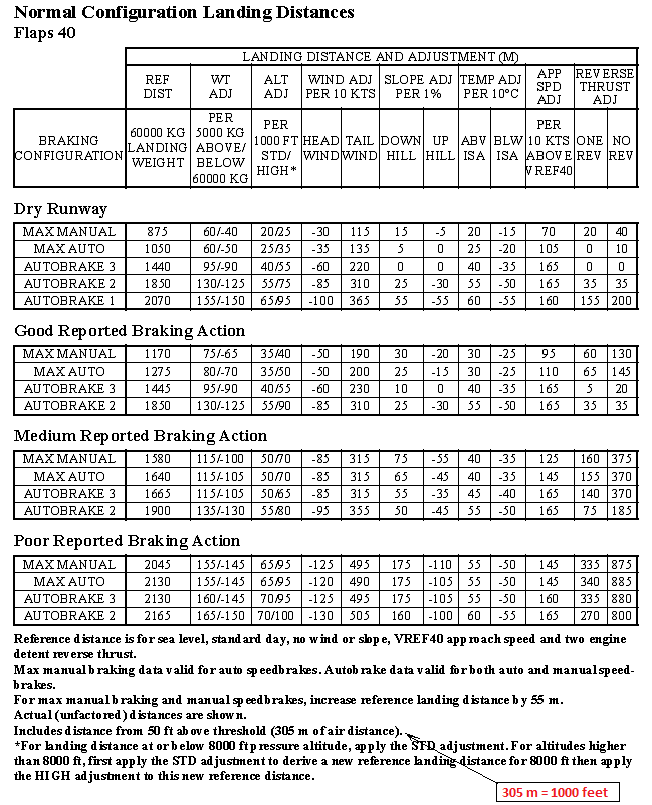 Before departing Calgary, the captain calculated an actual landing distance based on the medium braking action level and a landing weight of 60 000 kg with flap 40, autobrake 3 and in zero wind. That distance was 5463 feet (1665 m) (Appendix E). This distance assumes a threshold crossing height of 50 feet and touchdown within 1000 feet (305 m)Footnote 17 from the threshold. The operational flight plan's factored landing distanceFootnote 18 for the above configuration indicated a distance of 5744 feet for a wet runway.