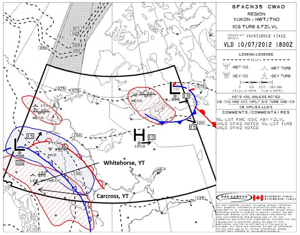 Weather conditions at the time of the occurrence were suitable for visual flight rules (VFR) operations. Weather observations recorded at Carcross around the time of the occurrence showed surface wind from the south at 23 knots gusting to 31 knots. The low-level winds were forecast to be from the southwest at 30 knots. The Graphic Area Forecast (Appendix A) indicated that the region south of Whitehorse and in the vicinity of Carcross would experience moderate turbulence from the surface to 12 000 feet above sea level as well as lee-wave mechanical turbulence. Wind conditions at the accident site were strong at the time of the occurrence.