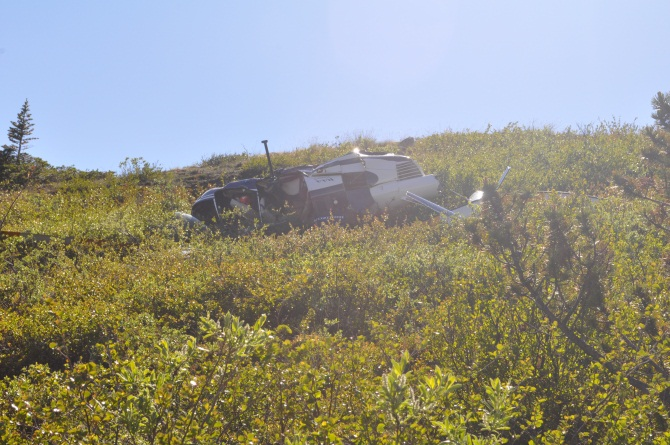 The investigation determined that the pilot overflew the site from the south and proceeded to turn 180° to the right. The helicopter then slowed to a hover, and began descending over the east side of the crest. Moments later, the helicopter experienced a gust of wind from the west, which caused it to drift to the left towards the eastern slope (lee side) of the crest. The helicopter then began an uncontrolled vertical descent. During this descent, the low rotor revolutions per minute (rpm) warning sounded and the main rotor tachometer dropped from 99% to 63%. The helicopter impacted the eastern side of the slope on the right-hand skid then rebounded down the slope before coming to rest nearly inverted on its left-side roof (Photo 1 and Photo 2).