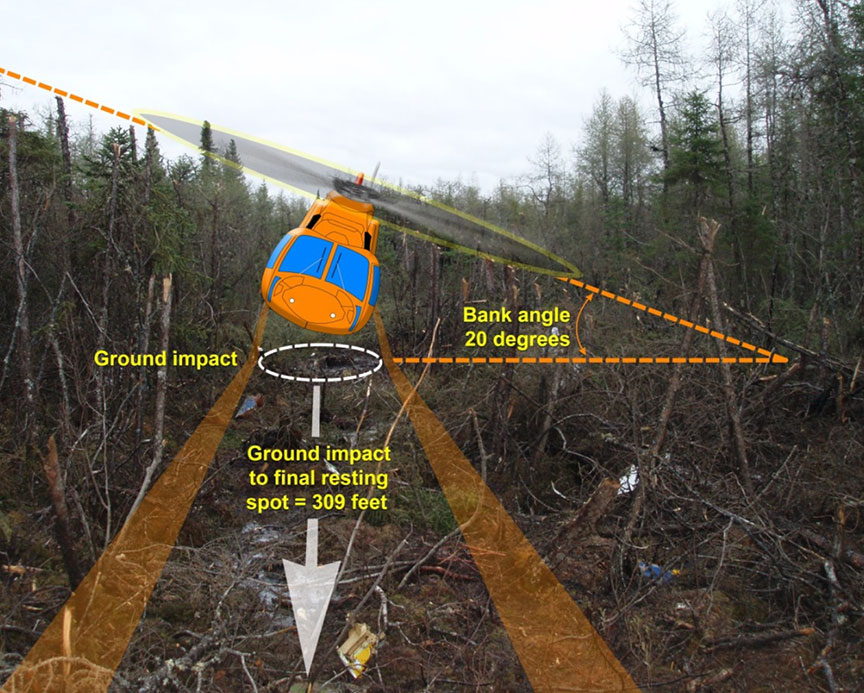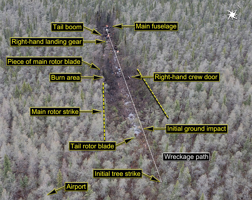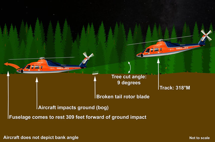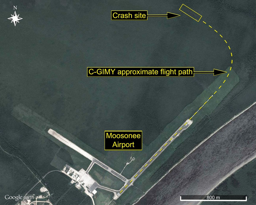 On 31 May 2013, at approximately 0011 Eastern Daylight Time, the Sikorsky S-76A helicopter (registration C-GIMY, serial number 760055), operated as Lifeflight 8, departed at night from Runway 06 at the Moosonee Airport, Ontario, on a visual flight rules flight to the Attawapiskat Airport, Ontario, with 2 pilots and 2 paramedics on board. As the helicopter climbed through 300 feet above the ground toward its planned cruising altitude of 1000 feet above sea level, the pilot flying commenced a left-hand turn toward the Attawapiskat Airport, approximately 119 nautical miles to the northwest of the Moosonee Airport. Twenty-three seconds later, the helicopter impacted trees and then struck the ground in an area of dense bush and swampy terrain. The aircraft was destroyed by impact forces and the ensuing post-crash fire. The helicopter’s satellite tracking system reported a takeoff message and then went inactive. The search-and-rescue satellite system did not detect a signal from the emergency locator transmitter. At approximately 0543, a search-and-rescue aircraft located the crash site approximately 1 nautical mile northeast of Runway 06, and deployed search-and-rescue technicians. However, there were no survivors.