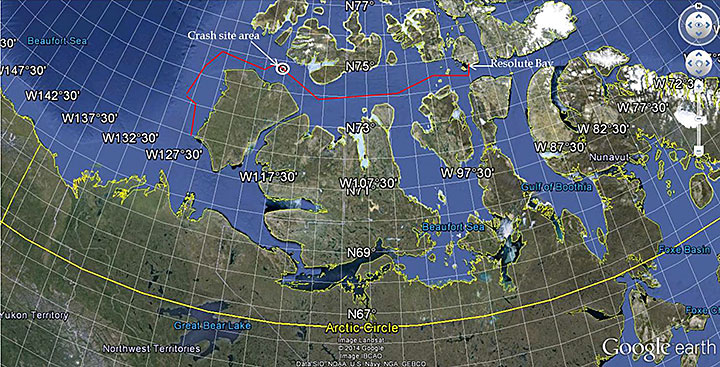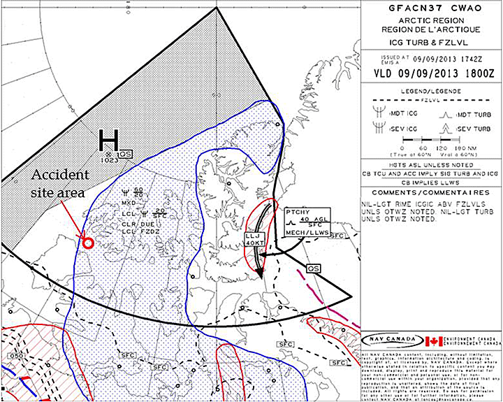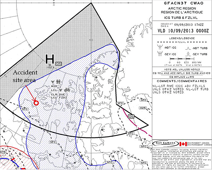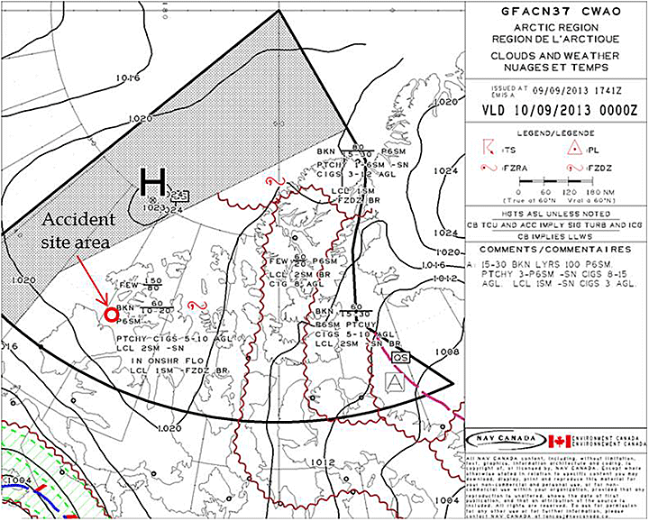 There are a limited number of aerodrome routine meteorological reports (METAR) from the Canadian Arctic Archipelago that include reports of sky condition (cloud heights and amounts), visibility and present weather. The closest METAR reporting location at the time of the occurrence would have been Sachs Harbour (CYSY), Northwest Territories, on the southwestern shore of Banks Island, about 200 nm away. The 1700 METAR indicated that the wind was from the east at 11 knots with a visibility of 15 statute miles (sm) with broken clouds at 1700 feet above ground level (agl) and another broken cloud layer at 25 000 feet agl, temperature of +2 °C and a dew point of +1 °C. A number of non-METAR weather observations are available for the area around the M'Clure Strait, but none of these provides sky conditions, visibility, or present weather.