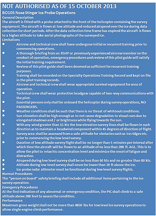 The modification pertaining to the installation of the ice survey system was approved in accordance with JCM Aerodesign Limited's STC SH01-4,Footnote 28 and the system had been installed on the CCG BO 105 since 2001. STC SH01-4 references the following documents: