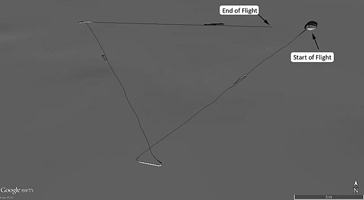 The data showed that the helicopter carried out a total of 6 survey runs flown at low altitudeFootnote 22 for periods ranging from approximately 7 to 9 minutes, except for the last run that ended in the impact, which lasted about 3 minutes. In total, during the 65-minute flight, the pilot spent approximately 43 minutes, or 66% of the air time, flying survey runs between 13 and 30 feet above the surface.