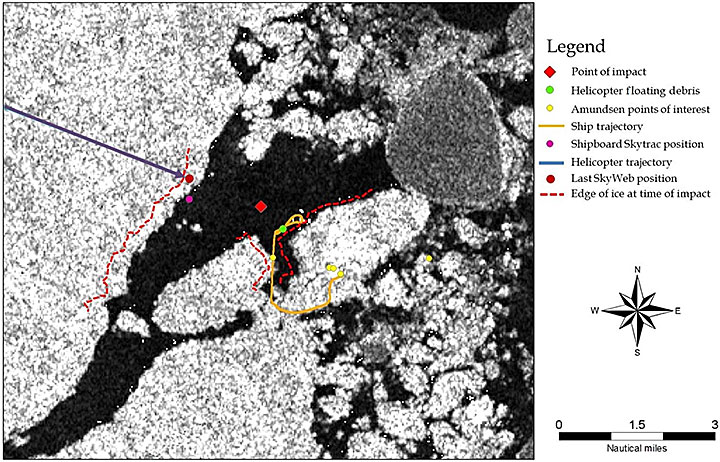 At 1824, the decision was made to proceed toward the helicopter's last displayed position. However, due to ice conditions, the vessel could not proceed direct. At 1841, the Trenton Joint Rescue Coordination Centre (JRCC) was informed of the situation.